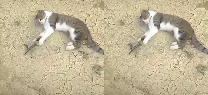 Thấy chim sẻ nằm bất động, chú mèo chủ quan thả lỏng, nhân cơ hội ấy sẻ chuồn thẳng khiến mèo tiếc hùi hụi.