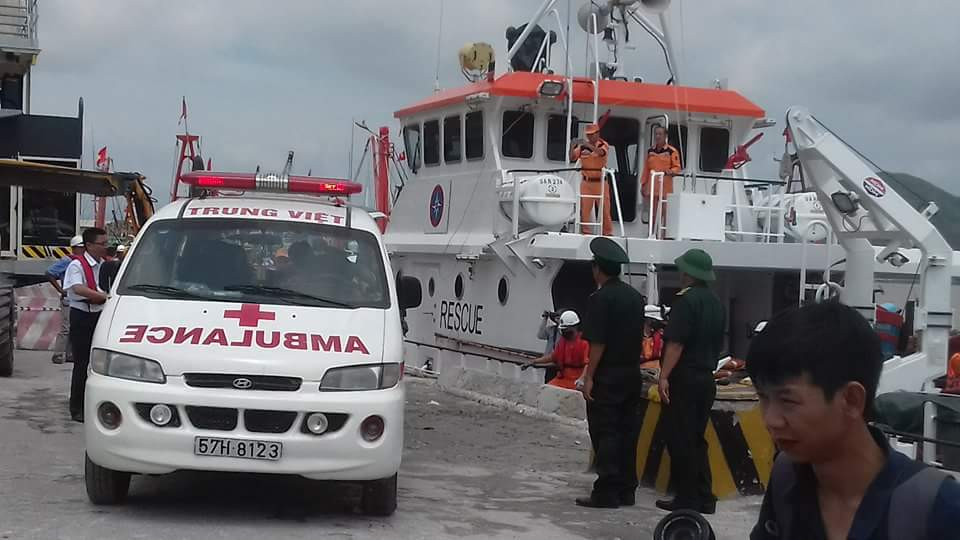Tàu cứu hộ đưa thi thể thuyền viên vào bờ. (Ảnh: Phan Sáng)