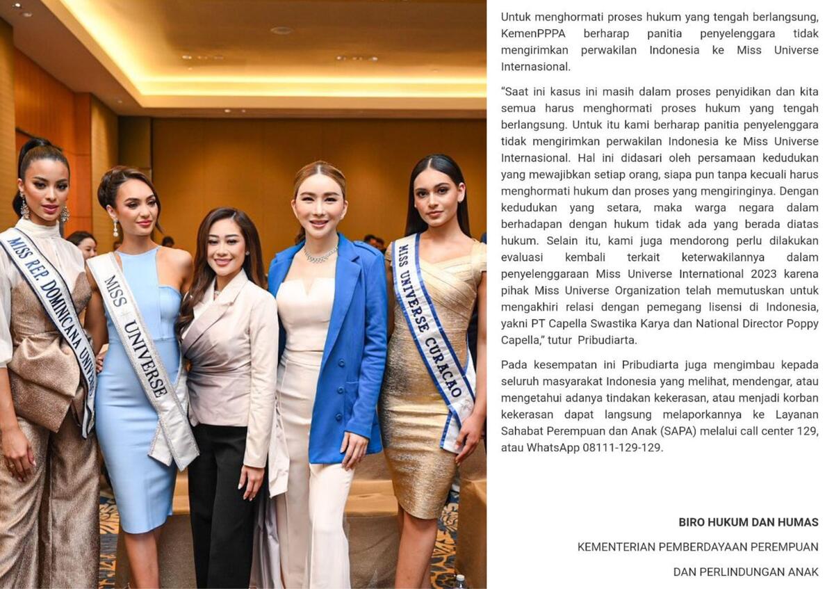 Đồng thời, cơ quan này yêu cầu đánh giá lại việc cử đại diện tham gia Miss Universe. Trước đó, Tổ chức Hoa hậu Hoàn vũ đã ra thông báo chấm dứt hợp đồng với công ty PT Capella Swastika Karya và Giám đốc quốc gia Poppy Capella.