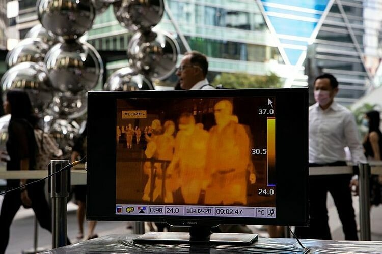 Màn hình đo thân nhiệt bên ngoài một tòa nhà văn phòng ở Singapore. (Ảnh: Bloomberg)