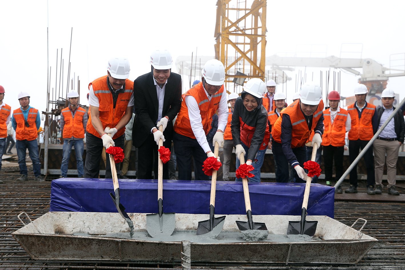 Đại diện của chủ đầu tư Tập đoàn FLC, đơn vị thi công FLC Faros và Ban quản lý dự án FLC Twin Towers thực hiện nghi lễ cất nóc