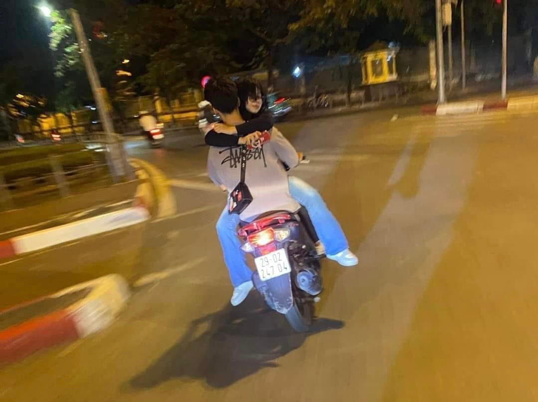 Đáng chú ý, trên quãng đường di chuyển về thì cả B. và bạn gái đều không đội mũ bảo hiểm, thậm chí còn đèo nhau trong tư thế “mặt đối mặt” rất nguy hiểm.