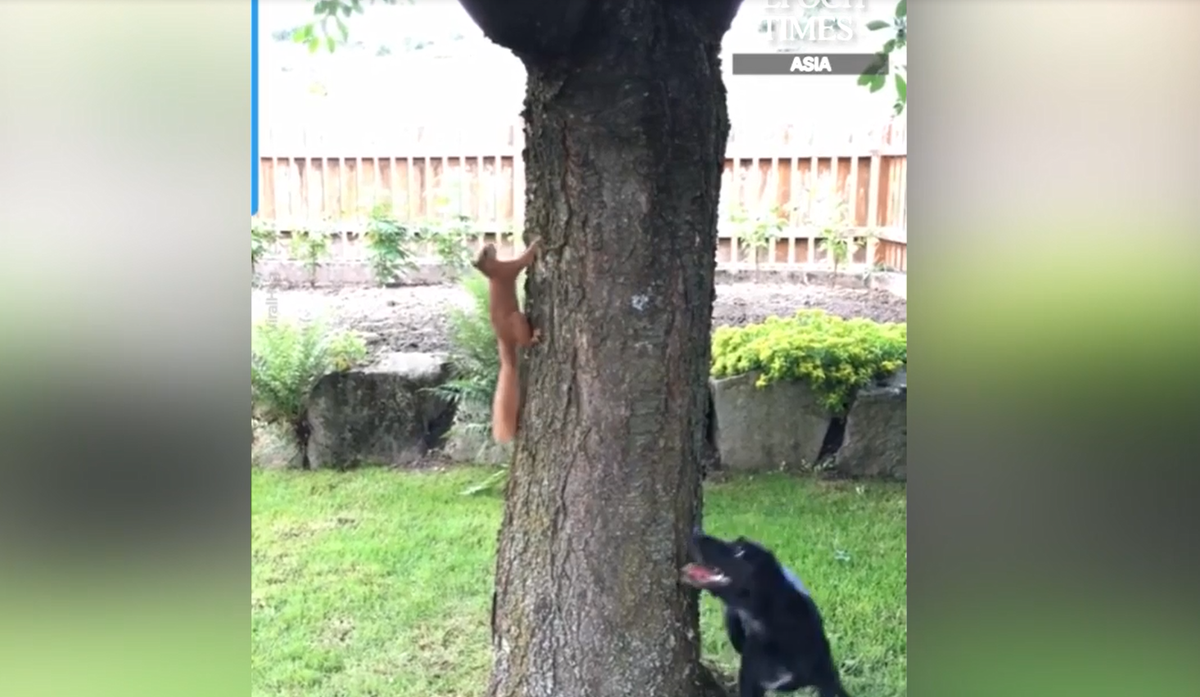 Chó bất lực đuổi sóc vòng quanh gốc cây