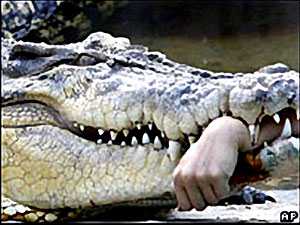 Khi bà Liên đang cho cá sấu ăn (tại Khu du lịch Đồng xanh, thành phố Pleiku) thì bất ngờ bị cá sấu cắn.