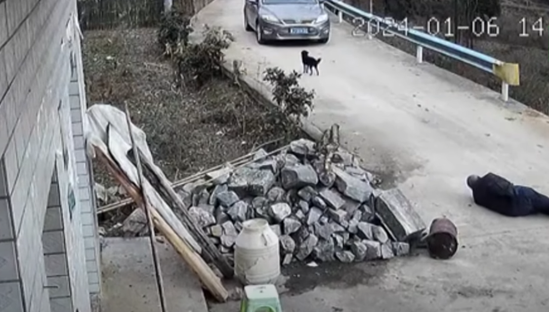 Thấy chủ nhân vấp ngã ra giữa đường chú chó đã chặn đầu xe ô tô để nhờ tài xế giúp đỡ, sự việc được ghi lại tại tỉnh Quý Châu, Trung Quốc.