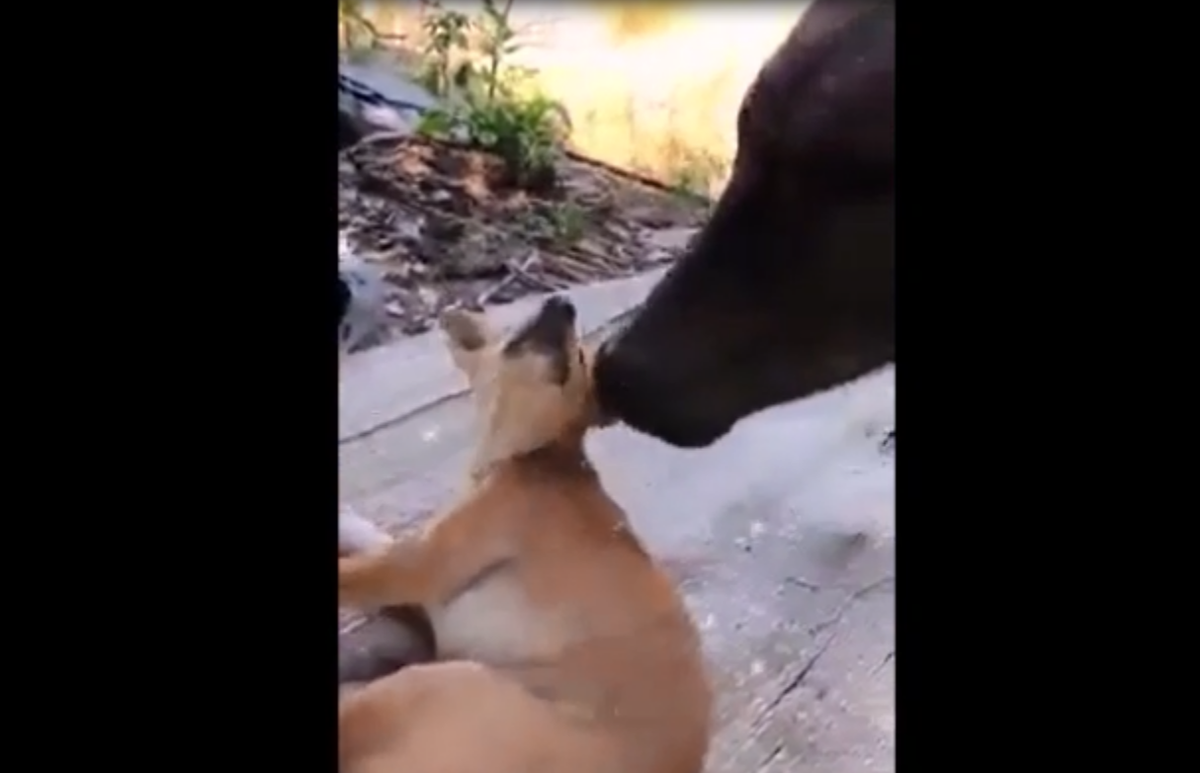 Đang lơ mơ ngủ, cún cưng hoảng sợ, phóng như bay khi nhận ra trâu đang âu yếm mình.