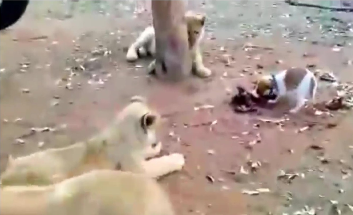 Sau nhiều lần sư tử mon men cướp thịt, chú chó con điên tiết nhảy chồm lên cắn, khiến sư tử rụt rè lùi lại phía sau vì sợ.