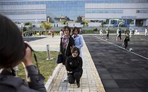 | Các cô gái trẻ đang chụp ảnh trước bách hóa Pothonggang ở Bình Nhưỡng. |