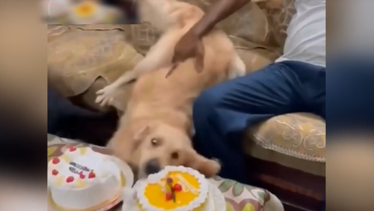 Chó giả vờ ngã để ăn vụng bánh sinh nhật