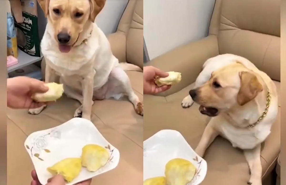 Phản ứng hài hước của chú chó khi bị ép ăn sầu riêng khiến nhiều người xem bật cười.