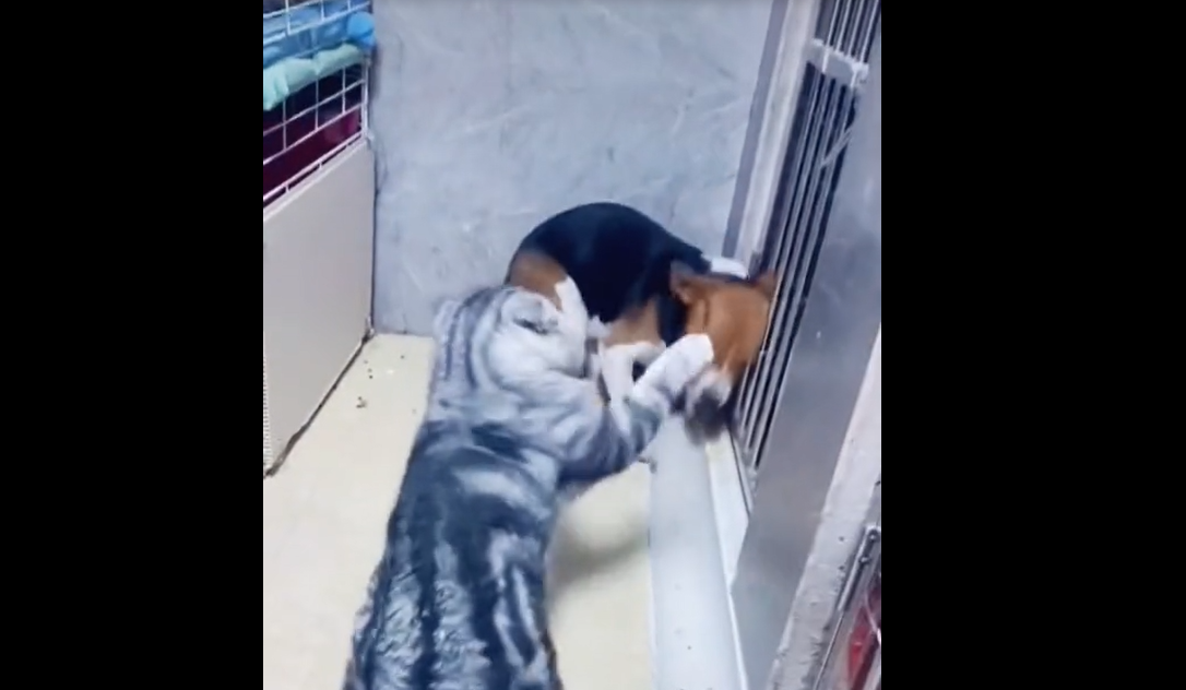 Chó giở trò ăn vạ khi bị mèo đánh