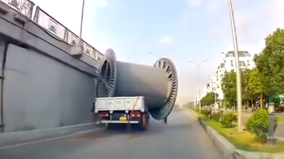 Xe tải chở hàng cồng kềnh va vào chân cột đèn trên cầu vượt tại ngã 3 Cầu Bính, Hải Phòng khiến khối sắt nghiêng sang một bên.