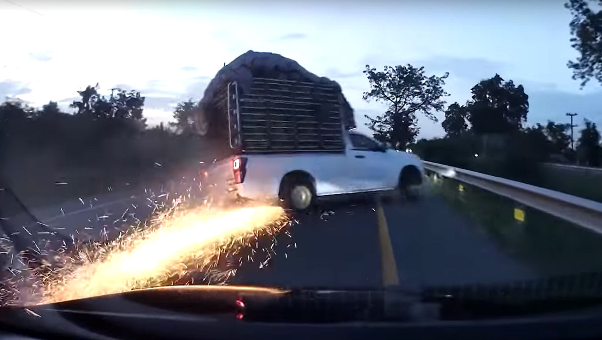 Chở hàng quá tải, ô tô nổ lốp nằm ngang đường ở Thái Lan