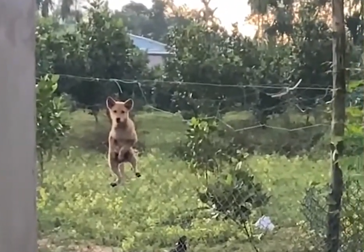 Chó leo rào đi chơi, mắc kẹt không xuống được