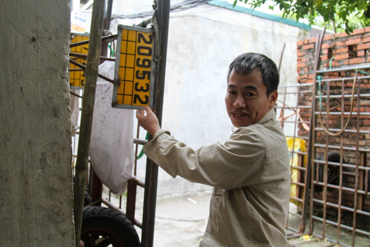 Đang chỉnh trang lại chiếc biển mẫu mới cho xe kéo của mình, ông Lăng Văn Bình cho biết đây là yêu cầu mới nhất của ban quản lý chợ. Tất cả phu xe muốn hoạt động trong chợ Long Biên phải xin giấy tờ chứng minh nhân thân từ quê để cấp lại biển và thẻ ra vào chợ.