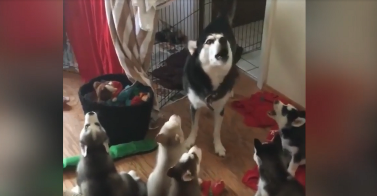 Năm chú chó con bắt chước hành động và tiếng 'hát' của chó mẹ, tạo ra dàn đồng ca vô cùng dễ thương.