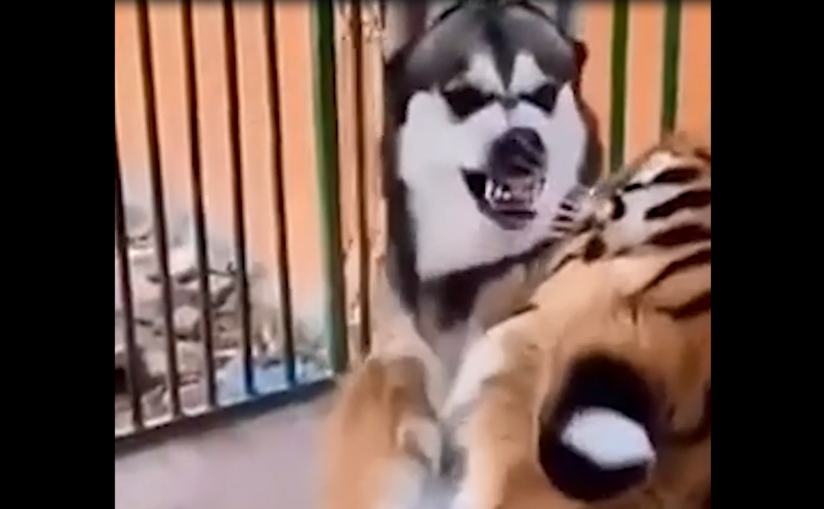 Tưởng hổ là mèo nên chú chó Husky ra oai, gầm gừ đe doạ, đến khi nhận ra thì lập tức "xuống nước".