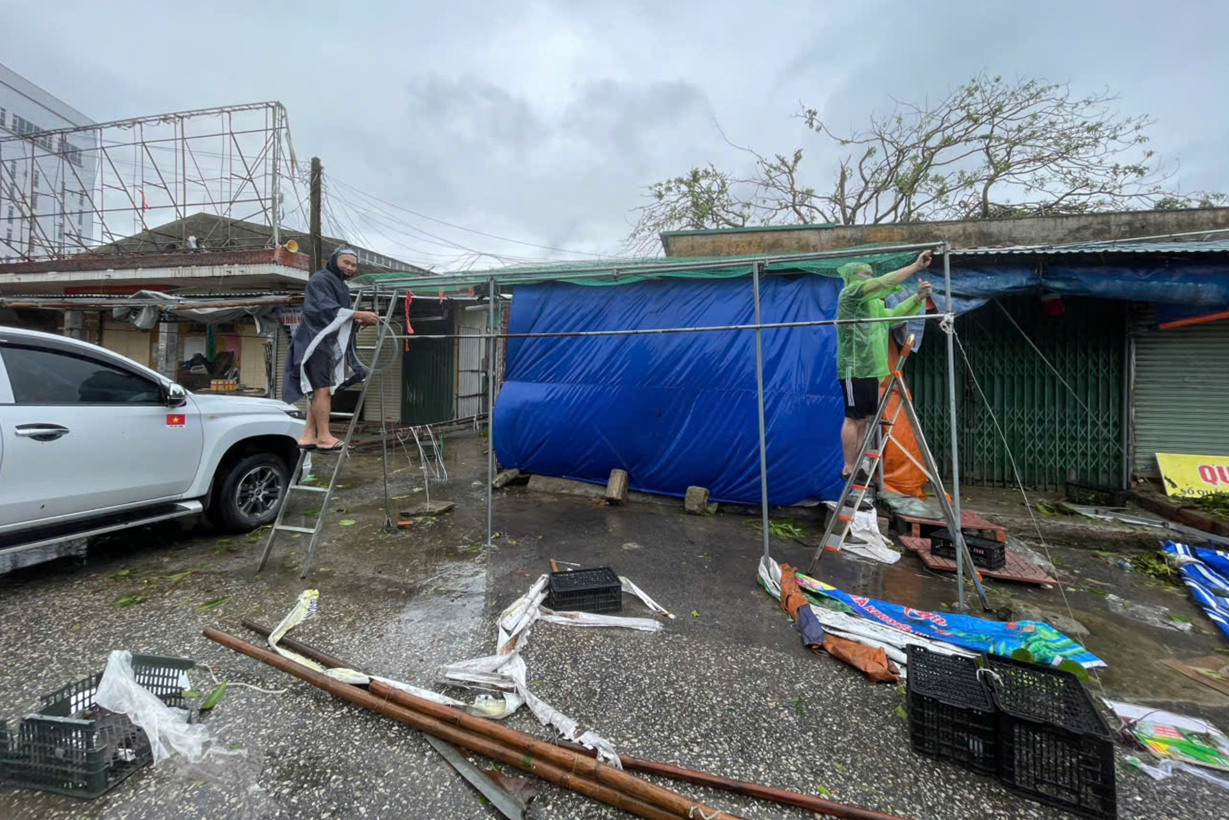 Dù mưa chưa tạnh hẳn nhưng nhiều tiểu thương vẫn tất tả thu dọn hàng hóa, cố che chắn những phần ki ốt còn sót lại. Với họ, đây là cách nhanh nhất để quay lại cuộc sống thường nhật, có thể kinh doanh và có thu nhập để sinh sống, hồi phục sau bão.