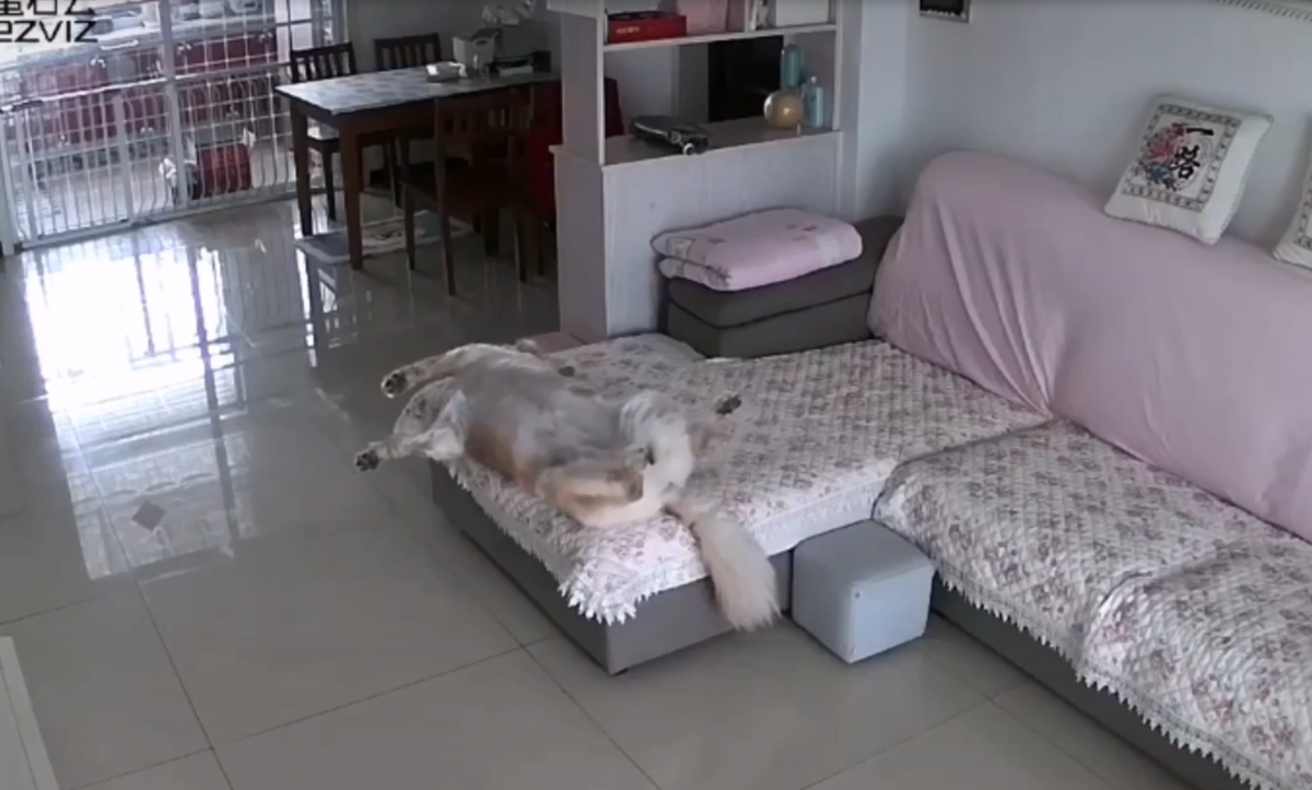 Không biết thấy gì trong giấc mơ mà chú chó ưỡn ẹo vặn mình rồi lăn khỏi sofa, tiếp đất bằng cả thân mình trong cơn ngái ngủ.