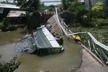 Do chở hàng quá tải (trong khi cầu chỉ cho phép trọng tải 8 tấn) nên khi xe leo lên đến giữa cầu thì nhiều tiếng răng rắc vang lên, cầu oằn xuống và đổ sụp, chiếc xe rơi tõm xuống sông.Số phân bón trên xe hòa nước gây vẩn đục khúc sông. Từ ca-bin xe, tài xế lóp ngóp mò lên bờ với thương tích nhẹ và được sơ cấp cứu tại chỗ.