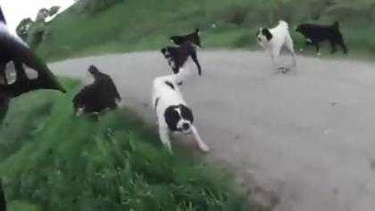 (VTC News) - Đang đi xe đạp thì đột nhiên có hàng chục con chó lao ra sủa, bao vây người đi xe đạp. Chúng chỉ dừng lại khi chủ ra gọi về.