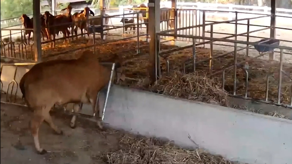 Chú chó chạy như bay khiến con bò sợ hãi nhảy ra chuồng và mắc kẹt đầu vào hàng rào kim loại tại Amnat Charoen, Thái Lan.