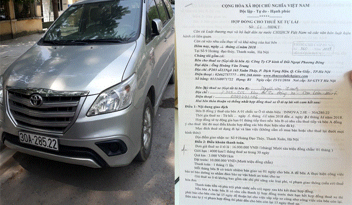 Chiếc xe của anh Trịnh Ngọc Thanh và hợp đồng cho thuê với Nguyễn Văn Thanh.