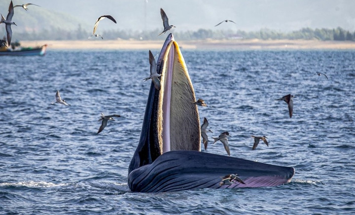 Khoảnh khắc cá voi phóng lên mặt nước, há miệng đớp mồi giữa vùng biển xanh, xung quanh là đàn chim hải âu bay lượn đã được ghi lại khiến mọi người trầm trồ thích thú.