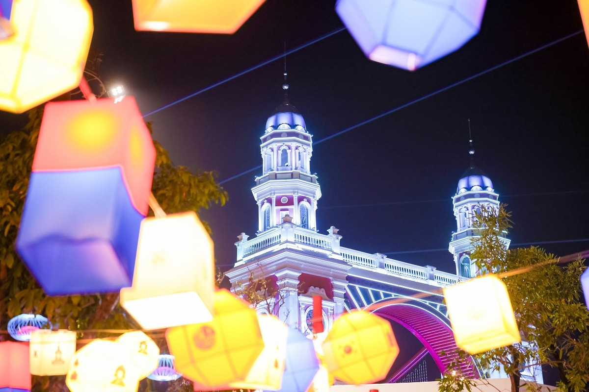 Các tuyến phố chính nối ra quảng trường trung tâm được trang hoàng bởi những dãy đèn lồng thủ công nhiều màu sắc, tạo nên không gian nghệ thuật đậm chất Á Đông và phảng phất sắc màu hoài cổ.