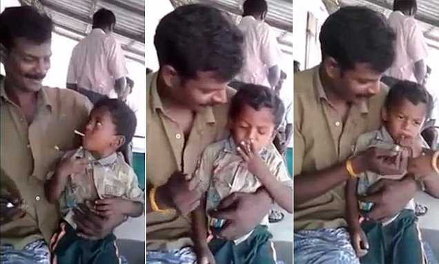 (VTC News) - Sau khi đặt điếu thuốc vào môi bé trai mới chừng 3-4 tuổi, người đàn ông châm lửa để cậu bé hút thuốc trong khi những người xung quanh cười rộ lên cổ vũ.
