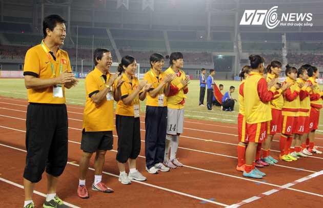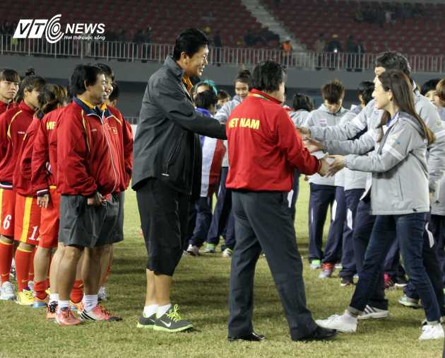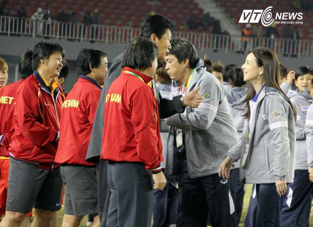 | Lãnh đội và HLV đội nữ Thái Lan tràn sang bắt tay HLV Phát và trưởng đoàn Phan Anh Tú |