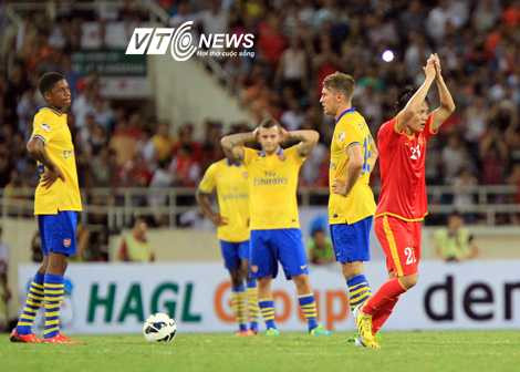 Chơi phòng ngự và có phần lép vế trước Pháo thủ, mãi tới phút 27, các tuyển thủ của chúng ta mới có được tình huống nguy hiểm đầu tiên. Niềm hy vọng số một trên hàng công, Lê Công Vinh dũng mãnh đi bóng từ cánh trái rồi tung ra cú dứt điểm cực nhanh. Đáng tiếc là bóng lại đi không chính xác.