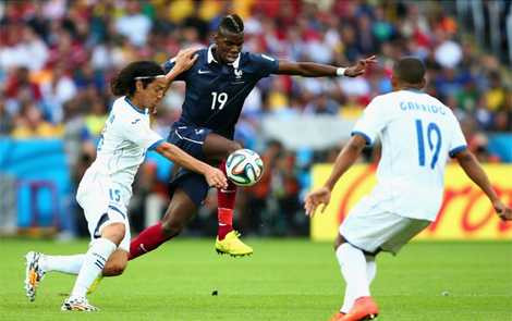 Pháp đã nhập cuộc không tốt bằng Honduras nhưng sau đó hoàn toàn lấn lướt. Tuy nhiên, phải tới cuối hiệp 1, Pháp mới có bàn thắng mở tỷ số từ chấm 11m khi tiền vệ Wilson Palacios phạm lỗi với Pogba trong vòng cấm. Cũng từ phút này, Honduras chỉ còn chơi 10 người vì Palacios nhận thẻ vàng thứ 2.
