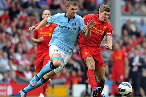 31' Gerrard xoạc bóng chính xác. Đội trưởng của Liverpool đã cản bóng ngay trong chân của Dzeko, nếu không tiền đạo người Bosnia đã kịp thời tung ra pha sút bóng cận thành.