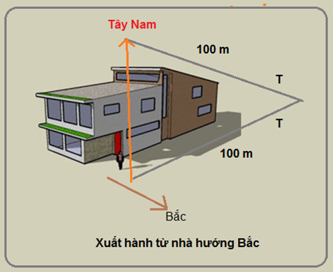 Ra khỏi nhà, rẽ phải, đến khi gặp một ngã tư (cách nhà bạn 100 m chẳng hạn) thì tiếp tục rẽ trái, đi thêm một đoạn cũng bằng 100 m thì dừng lại. Điểm đó nằm ở phía Tây Nam so với nhà bạn.