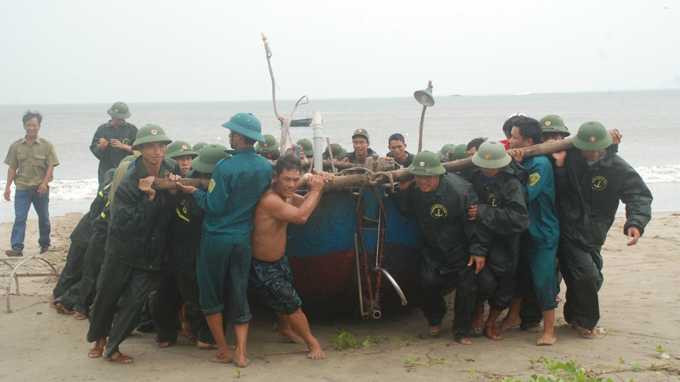 | Các lực lượng quân đội, dân quân tự vệ cùng người dân đưa tàu thuyền lên bờ |