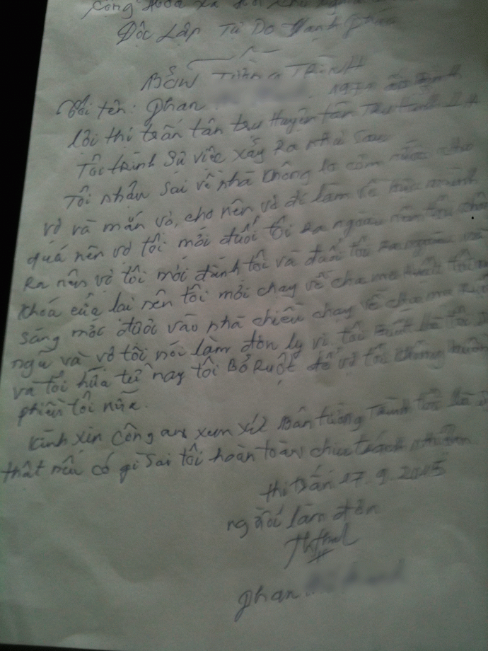 | Ông Th làm đơn trinh báo với cơ quan công an vì bị vợ bạo hành. |