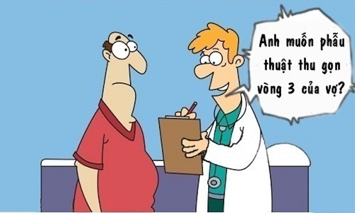 - Bác sĩ ạ, vòng 3 của vợ tôi ngày càng to ra khiến tôi không tài nào mà ôm được hết.