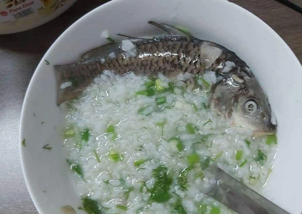 Có thể thấy trong bức hình, bát cháo vẫn còn lõng bõng hạt cơm, chưa kể con cá còn sống nguyên mắt cứ như đang mở nhìn trừng trừng. Bữa cháo tưởng ngọt ngào hóa ra lại thành đáng sợ không ngờ.