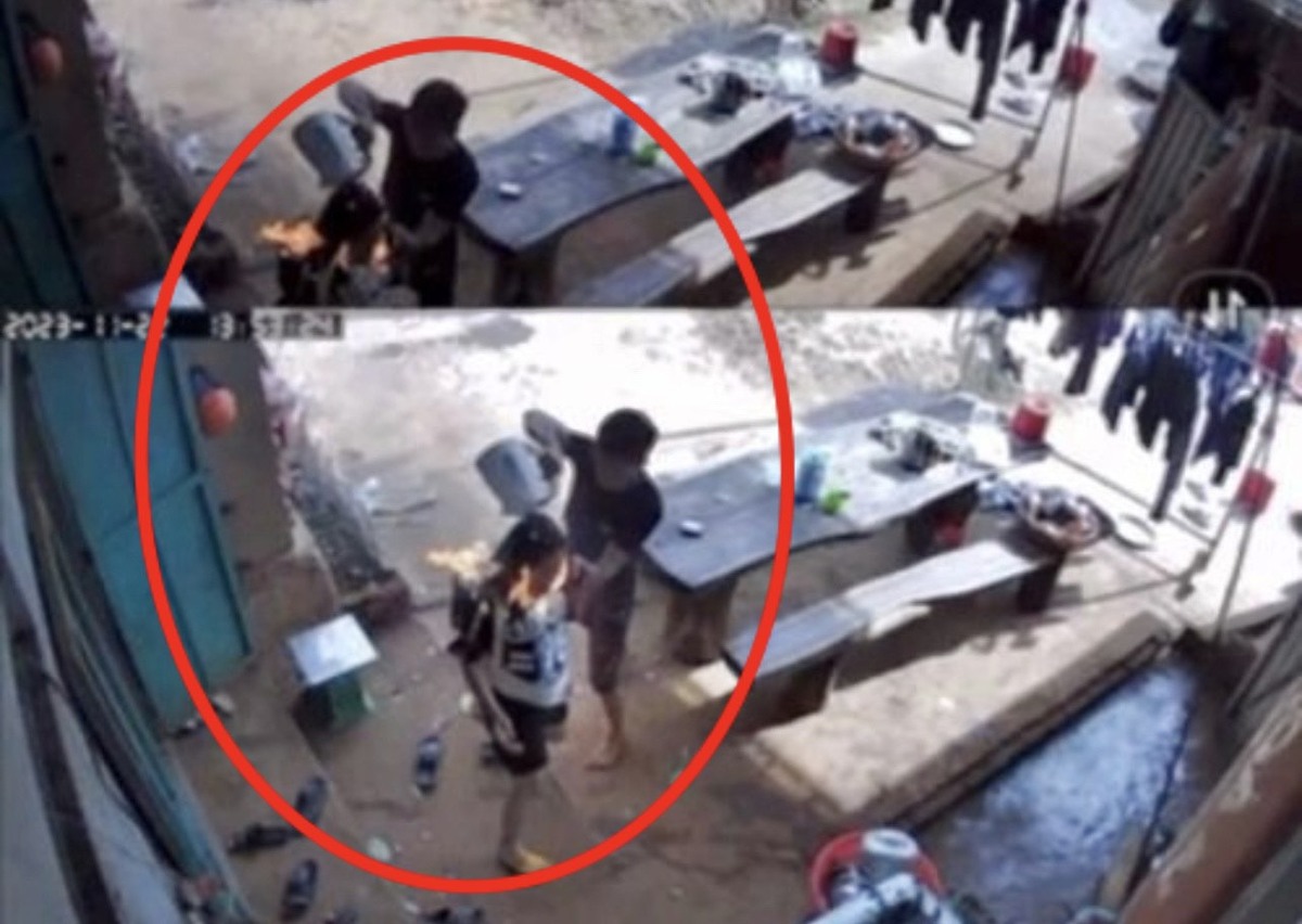 Lúc này, lửa bắt đầu cháy từ người chị O. lên can nhựa. Thấy vậy, Thanh vứt can nhựa ra sân.
