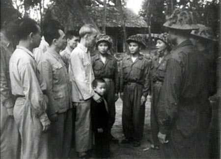 | Bác Hồ trò chuyện với 6 chiến sĩ Điện Biên Phủ (chú bé trong bức ảnh nay là Thiếu tướng Hồ Sĩ Hậu) |