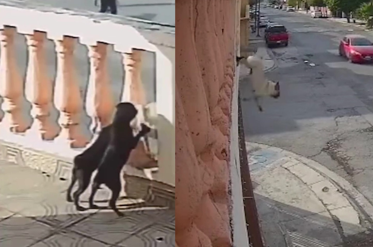 Lăng xăng chạy trước hóng hớt, chú chó bị bạn "ủn mông" ngã xuống đường, sau khi tiếp đất lại chạy về hóng hớt tiếp.