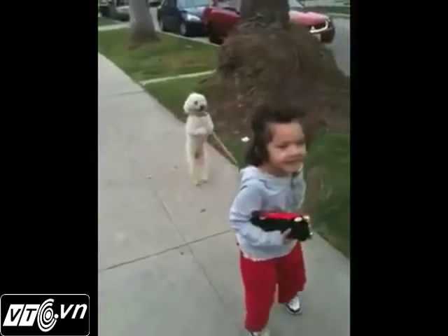 Chú chó đi bằng hai chân chạy theo chủ