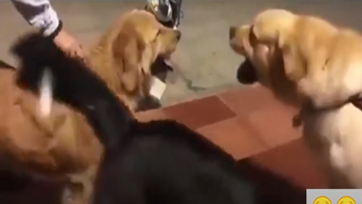 Chó đen đi ngang qua, vô tình chĩa "bàn tọa" vào hai chàng chó vàng đang hăng máu "cãi nhau" và nhận phải trái đắng.