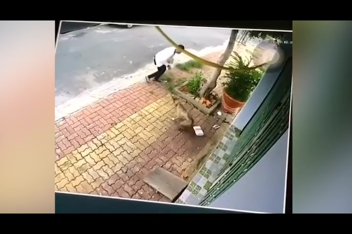 Chỉ muốn hoàn thành nhiệm vụ nhưng cứ bị chú chó chặn cửa, nam thanh niên phải dùng gach đe dọa mới đuổi được chó trong giây lát để nhét tờ rơi vào cửa.