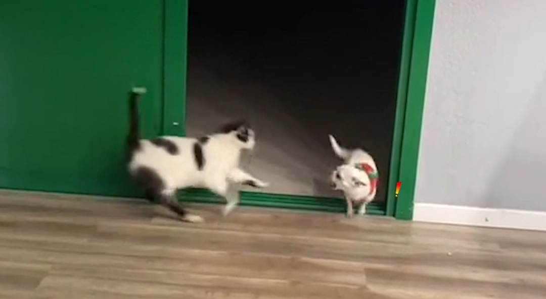 Đang thong dong bước qua khỏi cửa, chú chó bỗng nhiên giật mình "la toáng" vì bị mèo hù dọa, khiến cô chủ bật cười lớn.