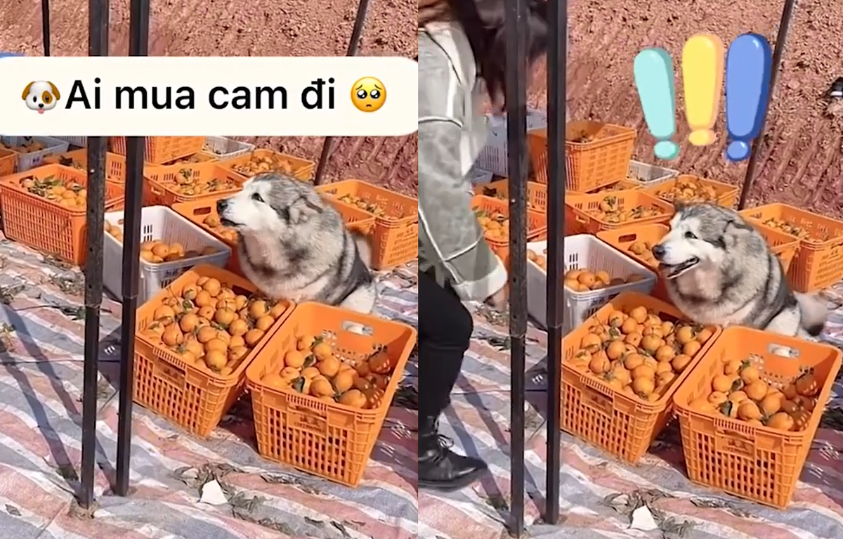 Chú chó ngồi bán cam, rao hàng như dân buôn chính hiệu