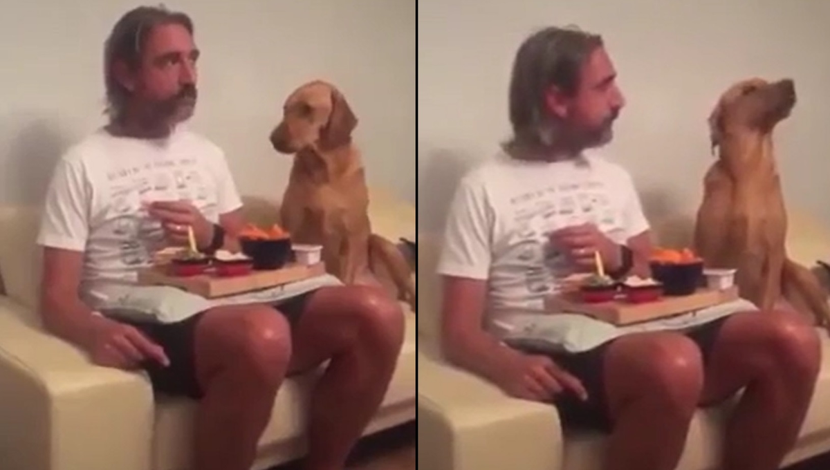 Chú chó 'sĩ diện' thèm thuồng nhìn lén chủ ăn