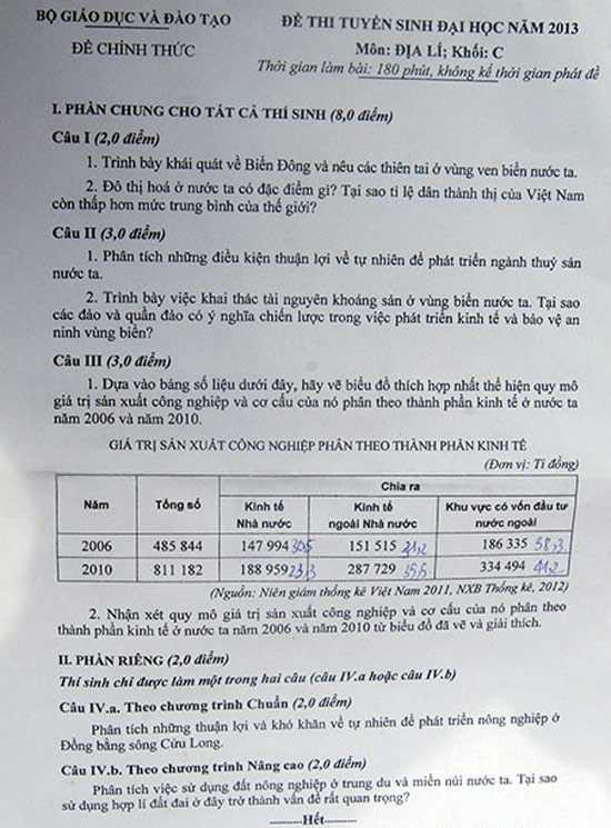 Cũng như các kỳ thi trước đó, chủ đề về biển đảo lại tiếp tục đưa vào đề thi môn Địa lý trong kỳ thi ĐH, CĐ năm 2013. Đối với câu hỏi này, nhiều thí sinh tỏ ra rất thích thú vì được đưa vào bài làm những kiến thức thực tế và các thông tin thời sự vào bài làm của mình.
