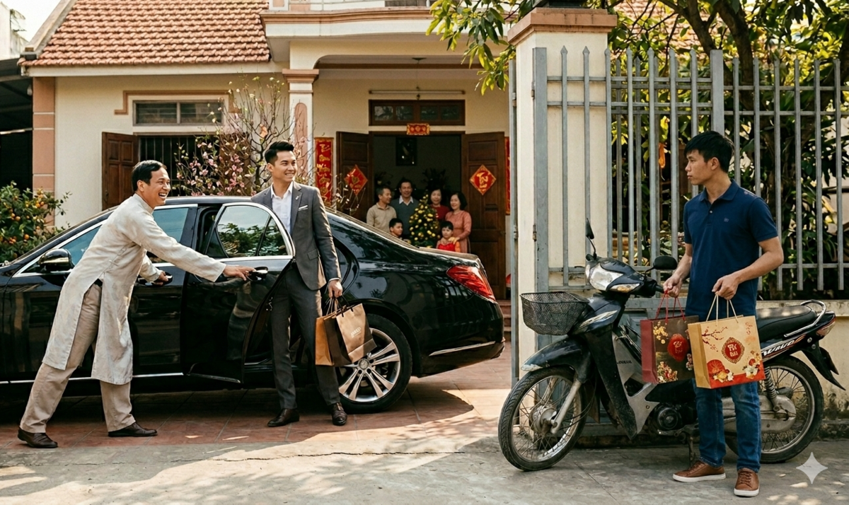 Thêm ít phút nữa, nghĩ chú thím có tuổi nên quên, tôi định gọi điện lại thì một chiếc ô tô hạng sang bóng loáng từ từ đi tới, xi-nhan tấp vào lề ngay sát chỗ tôi đứng. Tiếng động cơ tắt, ông anh họ giàu có bước xuống, bắt tay chào hỏi gia đình tôi. Rồi anh gọi vọng vào nhà.